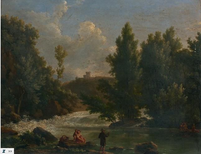 | Paysage de rivière animé d'un pêcheur et de baigneuses | |
