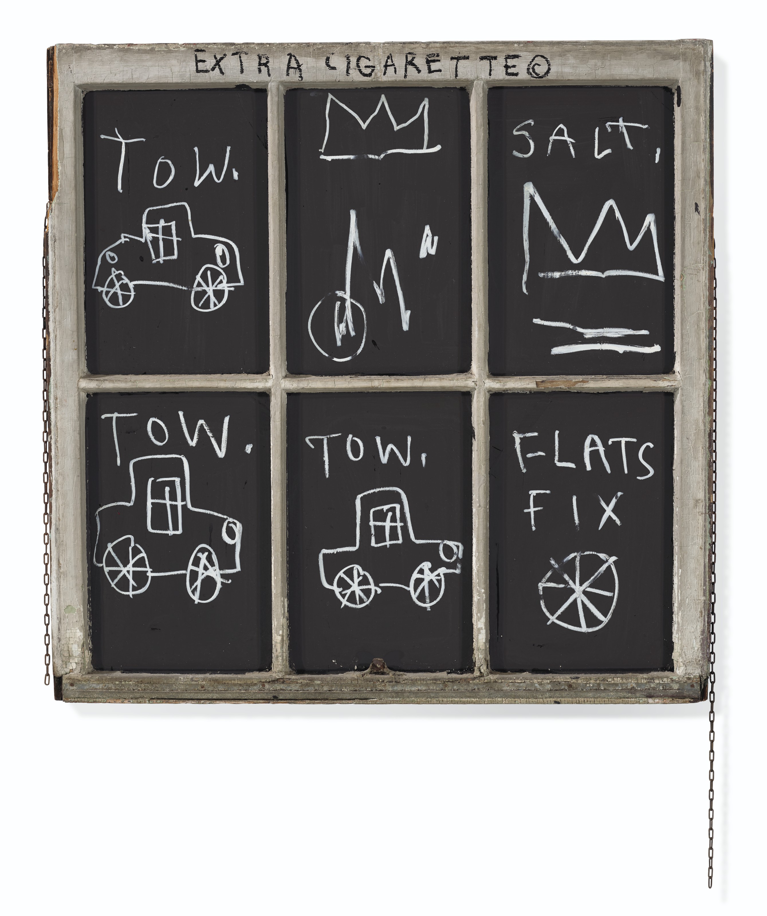 | Acrylic and oilstick on wood and glass window with chain | |
