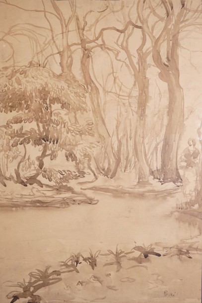 | Femme au bord de l'eau en sous-bois | |