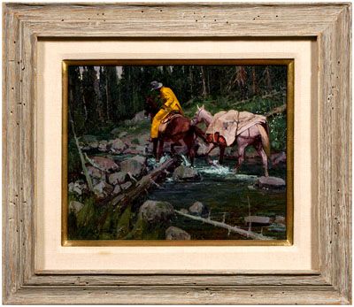 | rider traveling upstream with packhorse, titled verso “Rainy Days” | |