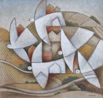 Doves over landscape