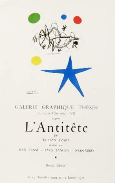 | Affiche pour la Galerie Graphique Thésée : L'Antitête par Tristan Tzara illustré par Max Ernst, Yves Tanguy, Joan Miró, Bordas E | |
