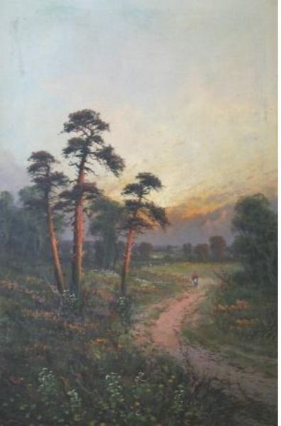 Landscape at sunset with a lone figure on a path,
