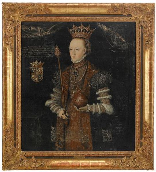 | Porträtt av Margareta Leijonhufvud (1516-1551) iklädd ymningt broderad och pärlbeströdd dräkt bärande riksregalierna - stående k | |