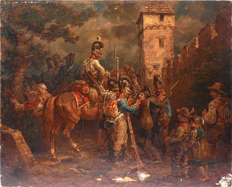 | Szene nach der Eroberung einer Stadt. Zahlreiche Soldaten kontrollieren unter der Aufsicht eines berittenen Offiziers die aus de | |