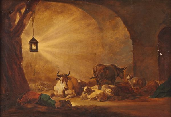 Schlafender Hirte mit Schafen und Kühen im Stall