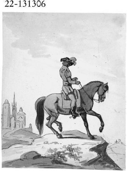 Ulanen auf einer Anhöhe. - Reiter in mittelalterlicher Tracht auf einem Felsvorsprung, im Hintergrund Klosteranlage. - Russische