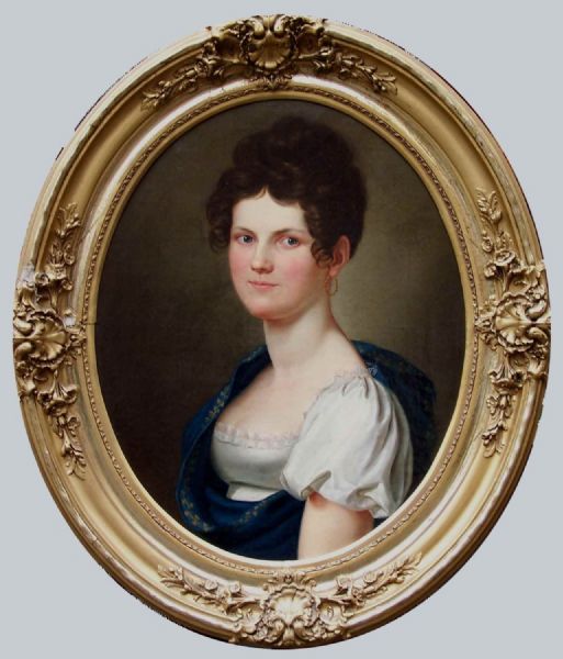 | Bildnis einer schönen jungen Frau in Rüschen besetztem Kleid mit Gold besticktem blauem Umhang im Oval. | |