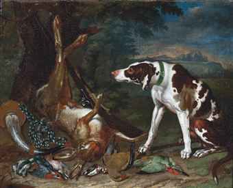 | A pointer with a hare, a musket, a hunting horn, finches and other birds, in a landscape | |
