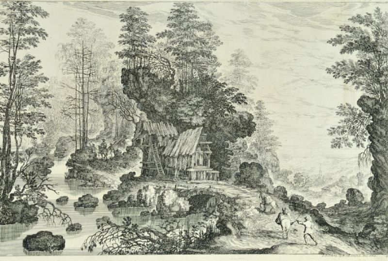 Personen mit Lasttieren an einer Hütte mit Steg in felsiger Waldlandschaft mit Bachlauf