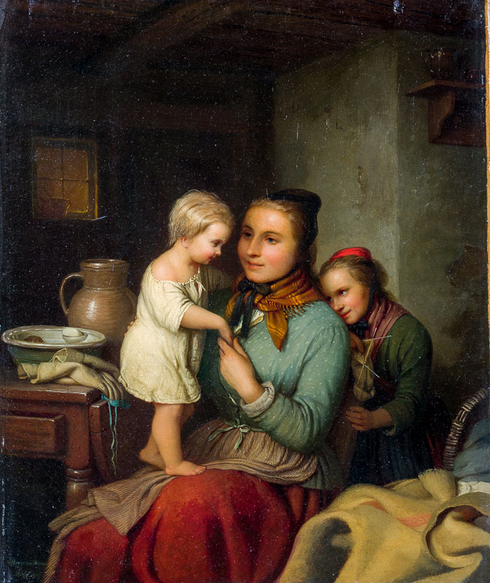 Gute Nacht Vielliebchen. Kleinkind im Nachthemd auf dem Schoß der Mutter neben Tischchen mit Waschschüssel und Wiege. Hinter dem Rücken der Mutter kl. Schwester mit Strickstrumpf in schwälmer Tracht, mit dem Geschwisterchen scherzend | |