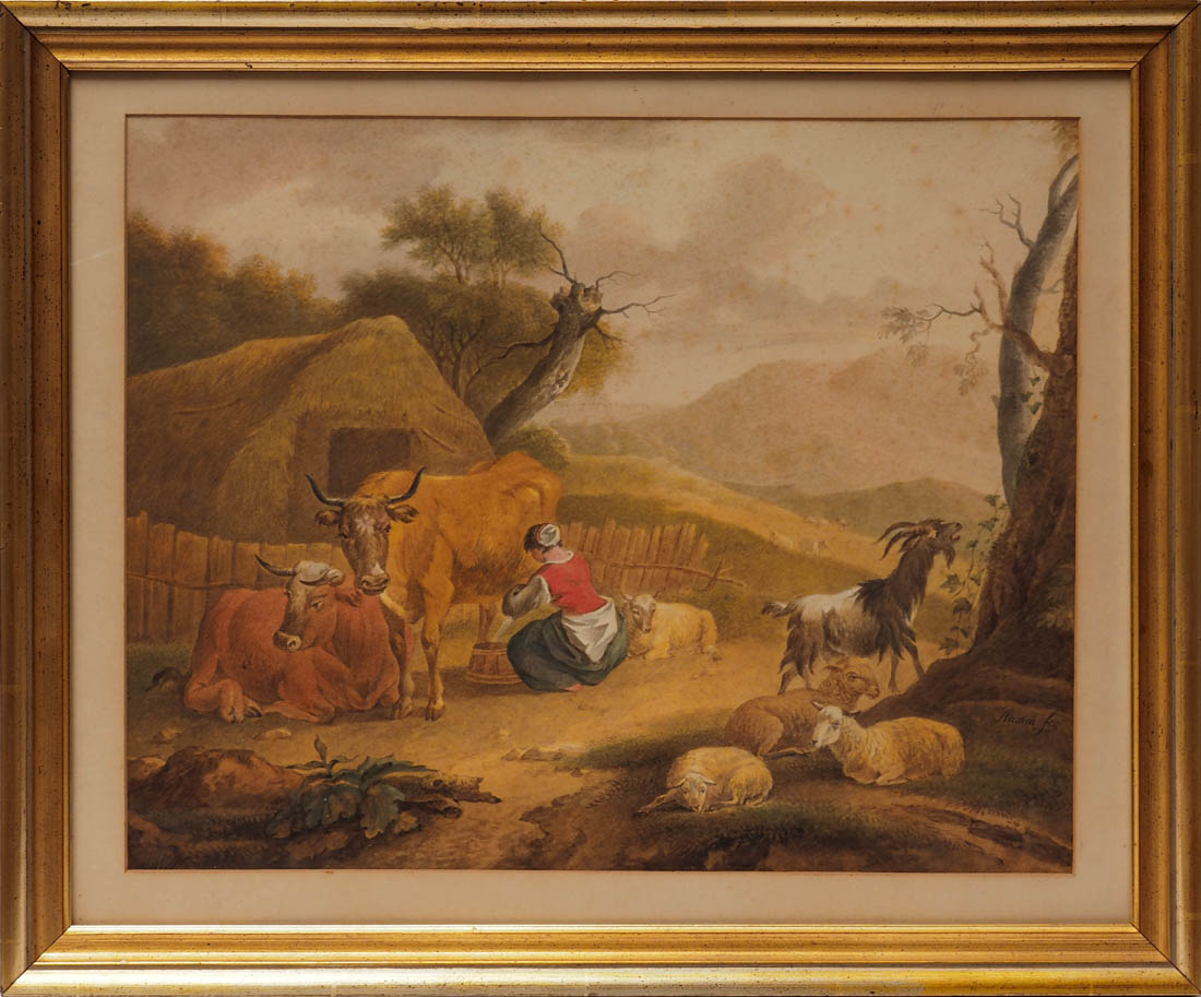 | Weite Landschaft unter wolkenverhangenem Himmel. Im Vordergrund eine Bäuerin beim Melken einer Kuh, daneben vier Schafe und eine | |