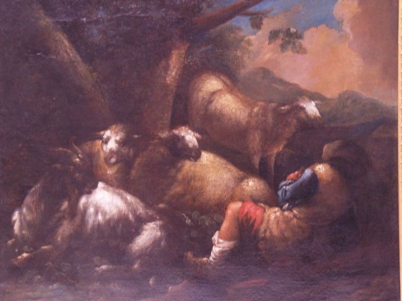 Hirtenidylle/Ruhender Hirte mit Schafherde in Landschaft