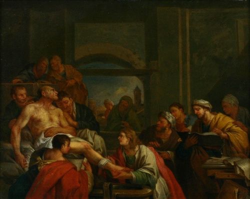 | Die Heilung eines Kranken in historischer, morgenländischer Szenerie. | |