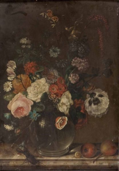 Blumen in Glasvase mit Hirschkäfer und Schnecke