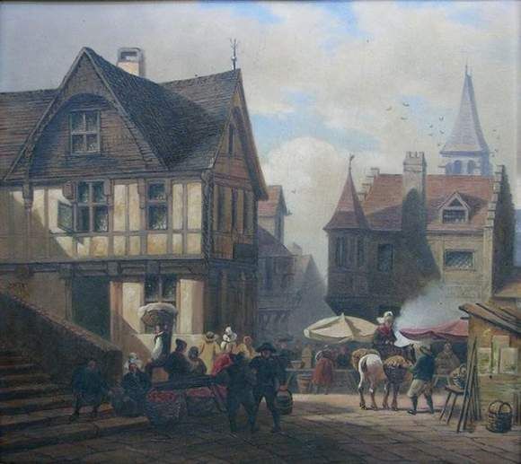 Reges Markttreiben in einem mittelalterlichen Städtchen mit Fachwerkhäusern.