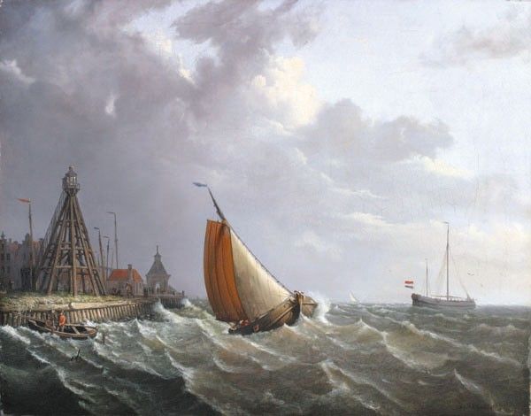 | Schepen voor de kust bij stormachtig weer, links een binnenhaven met vissersschepen en een lichtbaken | |