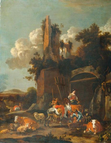 Hufschmied und Hirten mit Tieren vor Ruinen