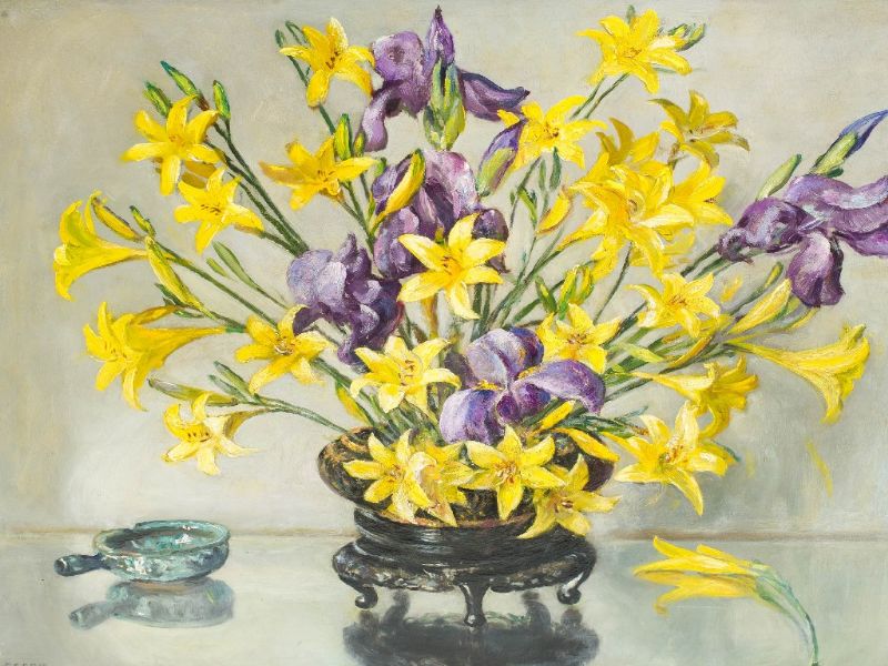 STILL LIFE OF DAY LILIES AND IRISES
