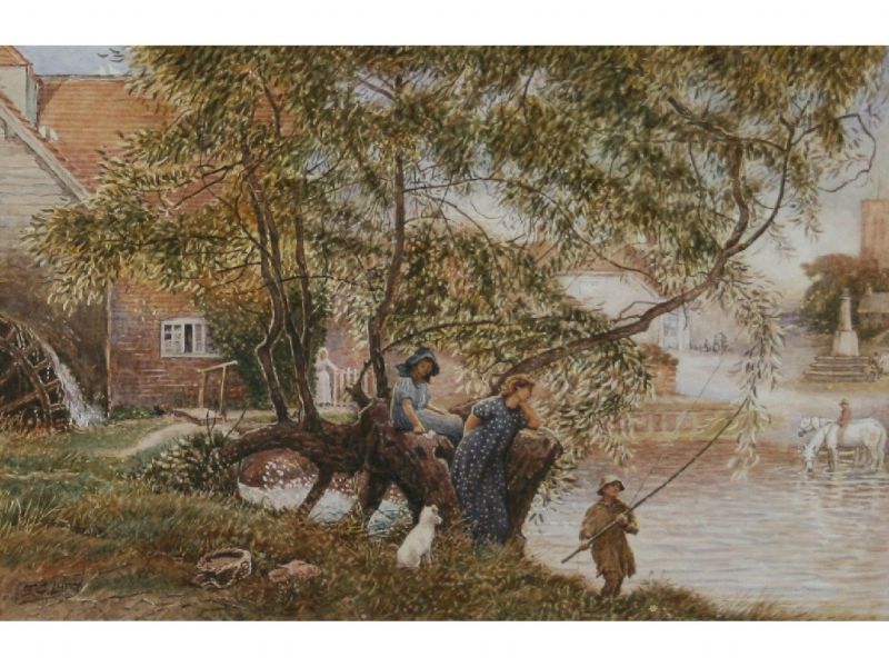 | two girls resting on a riverside tree trunk with boy casting his fishing rod, horses watering and buildings beyond | |