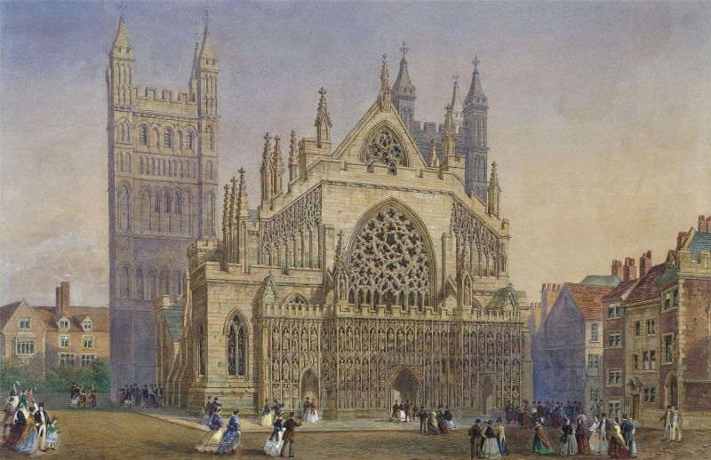 Elegant figures outside Exeter Cathedral