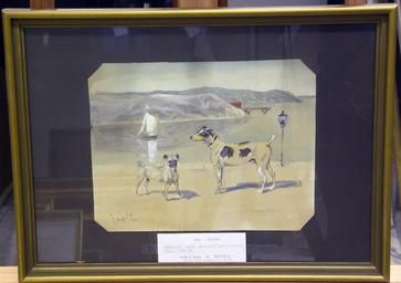 Hundar vid vik med segelbåt.