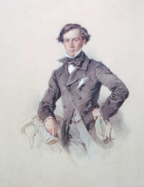 ortrait of a young man wearing a black coat, holding a sword in his right hand