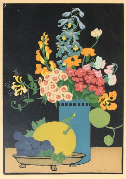 Still life of vase of flowers and bowl of fruit
