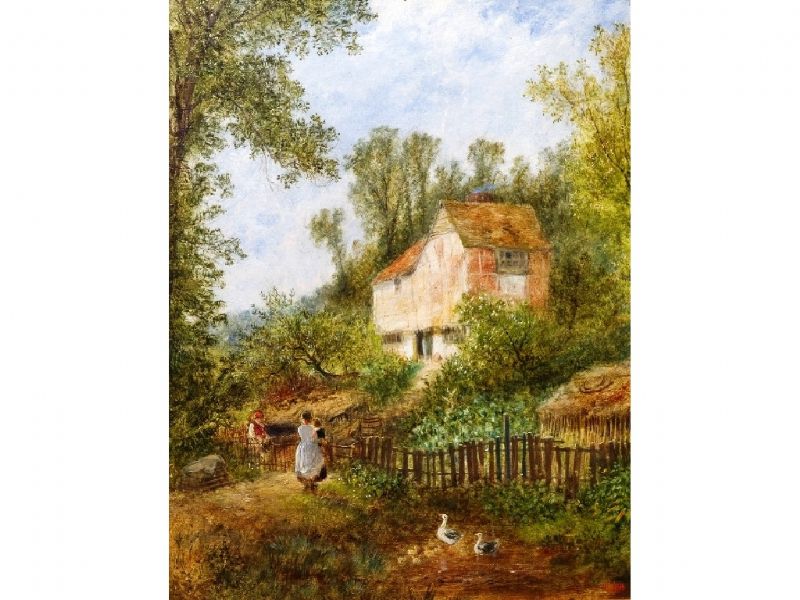 MOTHER AND CHILD BY A COTTAGE GARDEN