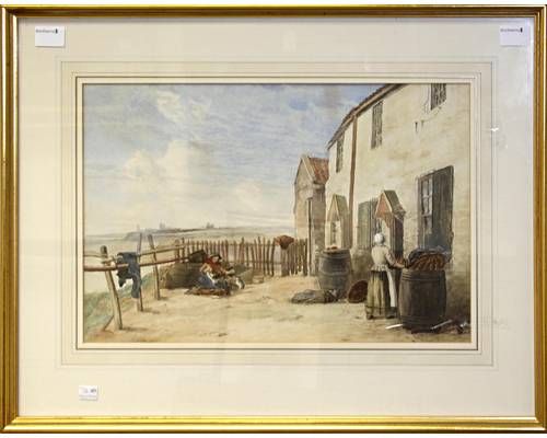 Fisherwomen outside cottages near the sea