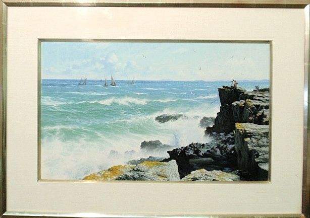 | waves breaking on a rocky shoreline with figures standing on the cliffs watching ships sailing in the background | |