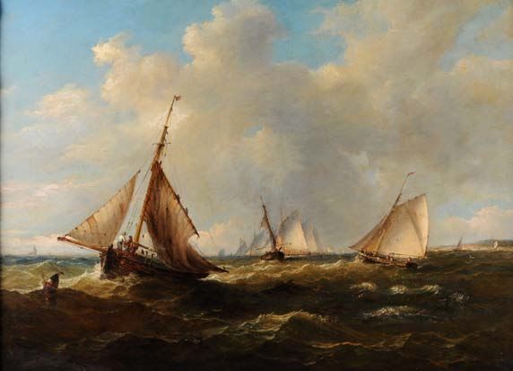 | Fishing smacks in choppy waters off a coast, possibly Felixstowe | |