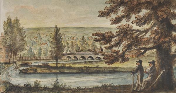 Landscape with bridge over a river and figures by a tree