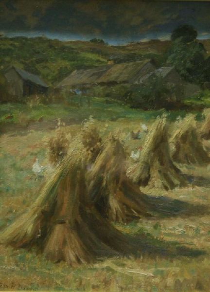 | HAYRICKS WITH HENS, a rural harvesting landscape | |