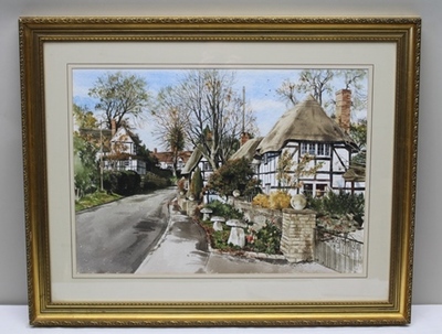 | Stratford Road, Harvington, Worcestershire, half timbered thatched cottages | |