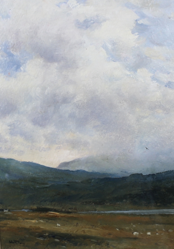 a mountainous landscape with sheep and a croft in the foreground