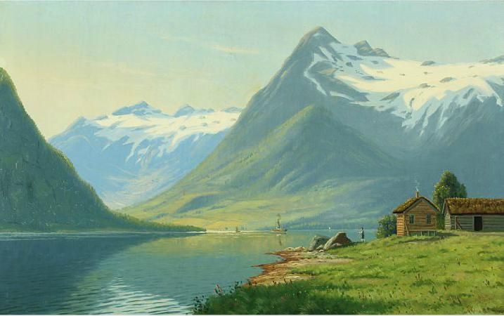 View over the inlet of Hardanger with ships and person by a cabin.