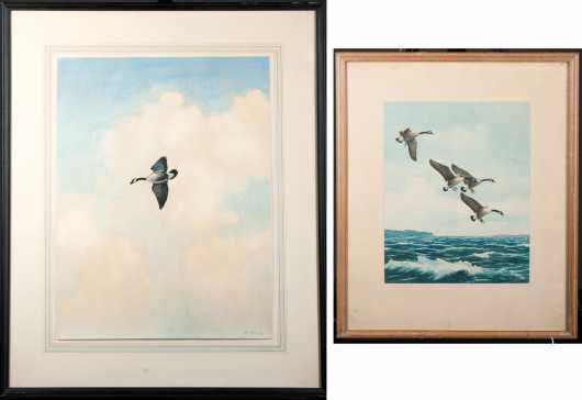 Large watercolor on paper of a Canada Goose in flight amongst the clouds