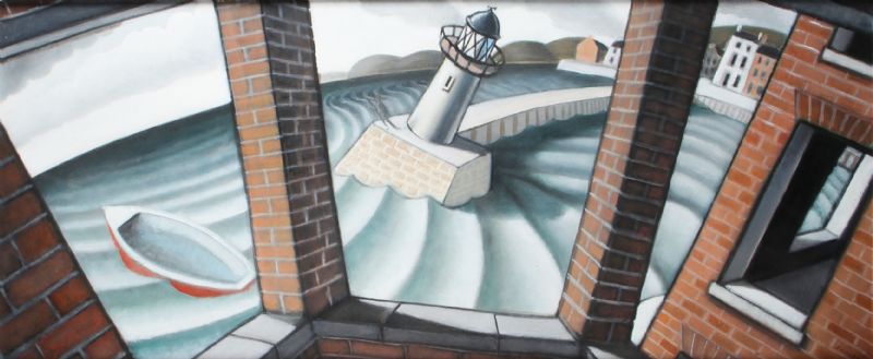 | Contemporary coastal landscape, with lighthouse and pier viewed through red brick pillars, additionally | |