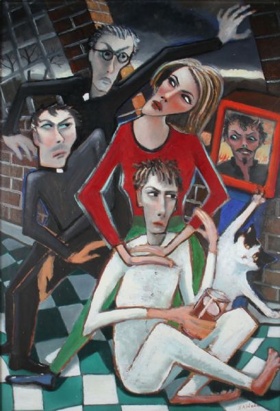 | Contemporary figurative composition with seated man, surrounded by woman, two vicars, a black and white cat and an image of the | |
