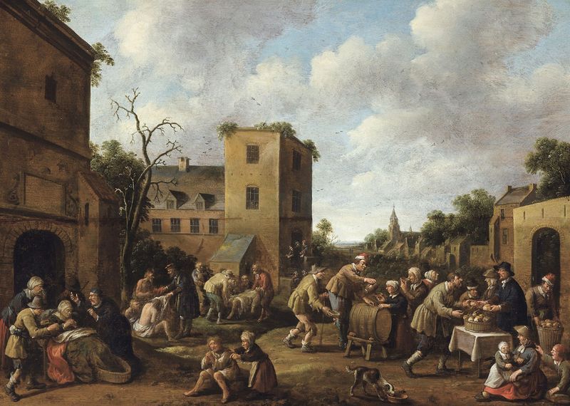 Vue de village avec les sept œuvres de charité