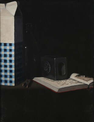 Still life with milk carton and book