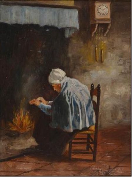 Paysanne se réchauffant près du feu
