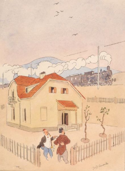 2 Männer unterhalten sich am Bahnwärterhäuschen; ein Zug kommt