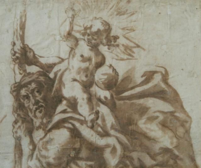 | CARTOON IN SEPIA WASH, putti seated on the back of a bearded gentleman, laid down on card within a card mount and moulded frame | |
