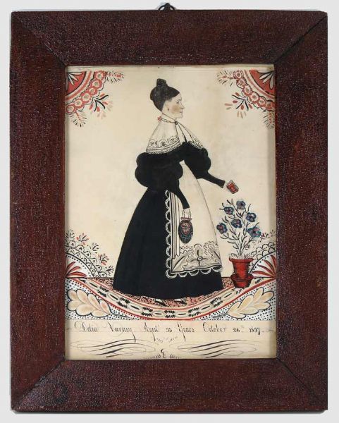 | woman in black dress, collar and apron holding purse and book, flowering potted plant on patterned carpet, spandrels to corners, | |