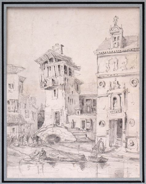 Blick auf eine südländische Stadt mit Kanälen und Figurenstaffage