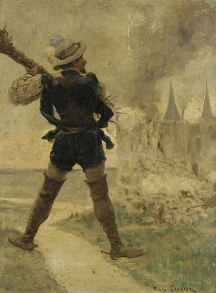 Personnage devant un fort en flammes.