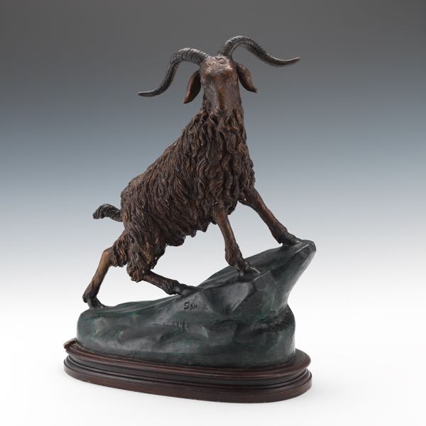 | Cast metal sculpture of a goat on a rocky formation. Patinated brown with the rock verdigris and black | |