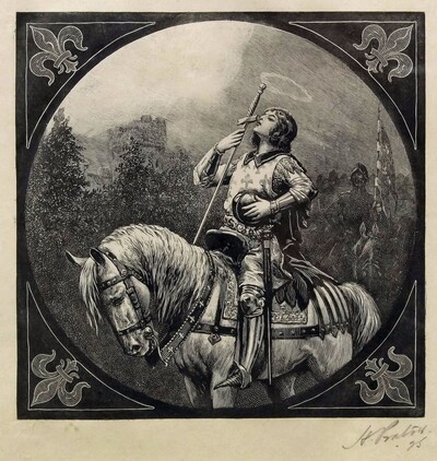 | Joan of Arc wearing armour and mounted upon a horse at the head of her troops | |